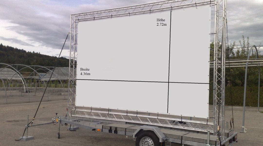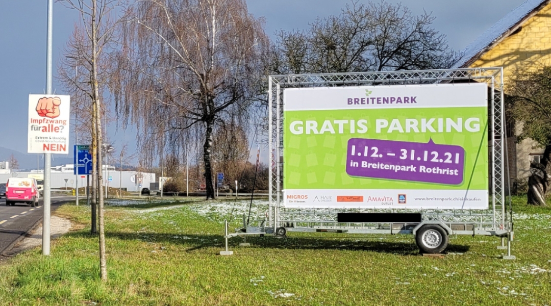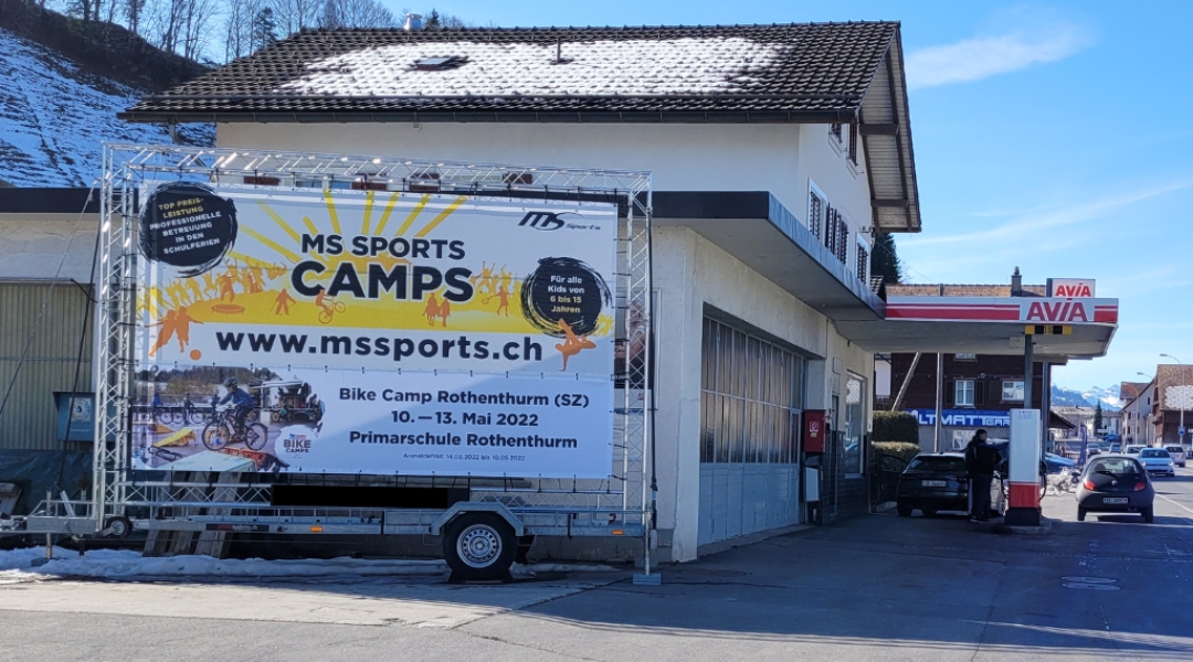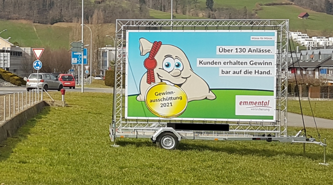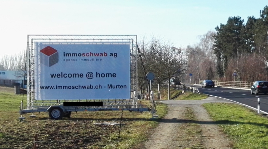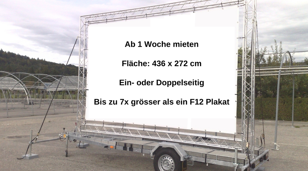 Wir setzen dein Angebot mobil optimal in Szene. Platzieren deine Botschaft mit dem Grossformat-Werbeanhänger (4,36 x 2,72m) da, wo sie ideal sichtbar ist.