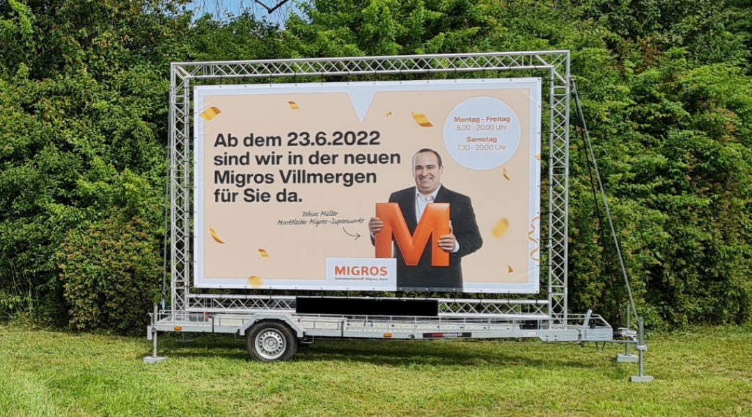 Wir sind überzeugt, dass mit einem mobilen Grossplakat Werbeanhänger dein Angebot garantiert auffällt.